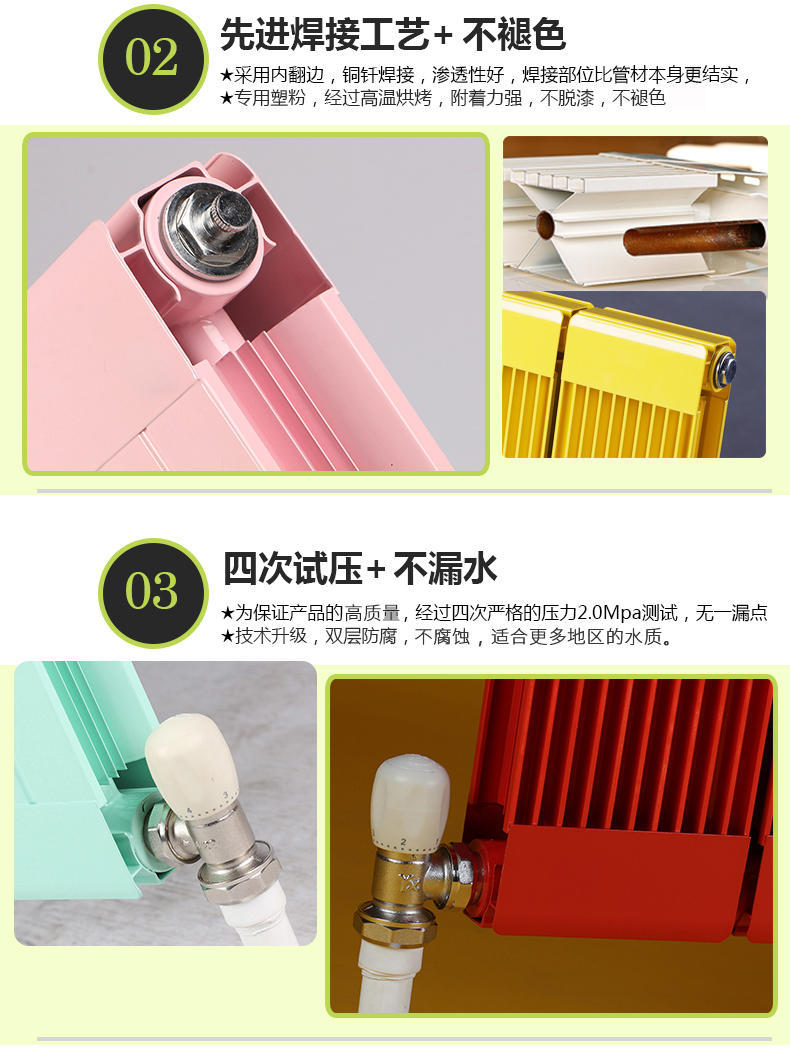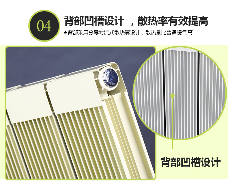 3、克服了鑄鐵散熱器承壓低、金屬熱強(qiáng)度低、裝飾性能差的缺點(diǎn);
