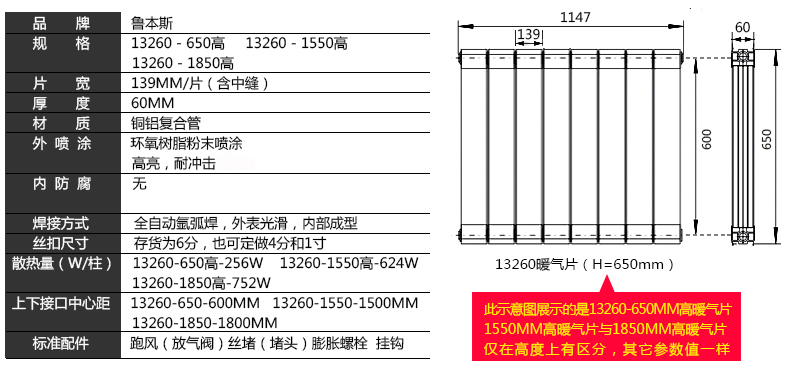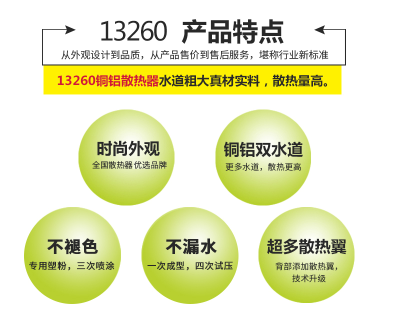 魯本斯銅鋁復(fù)合13260系列暖氣片/散熱器,超大雙水道銅鋁復(fù)合暖氣片,均勻強(qiáng)化內(nèi)部對流效果。全銅水道,主動(dòng)防腐,鋁翼片散熱佳,對水質(zhì)無要求,放心可靠,使用壽命長。