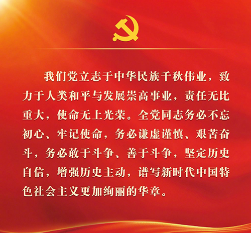 一、我們黨立志于中華民族千秋偉業(yè),致力于人類和平與發(fā)展崇高事業(yè),責(zé)任無比重大,使命無上光榮。全黨同志務(wù)必不忘初心、牢記使命,務(wù)必謙虛謹(jǐn)慎、艱苦奮斗,務(wù)必敢于斗爭(zhēng)、善于斗爭(zhēng),堅(jiān)定歷史自信,增強(qiáng)歷史主動(dòng),譜寫新時(shí)代中國(guó)特色社會(huì)主義更加絢麗的華章。