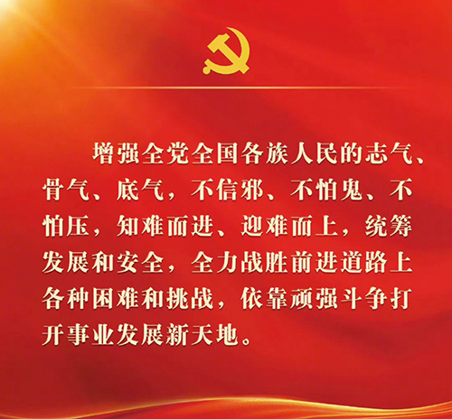 八、增強(qiáng)全黨全國(guó)各族人民的志氣、骨氣、底氣,不信邪、不怕鬼、不怕壓,知難而進(jìn)、迎難而上,統(tǒng)籌發(fā)展和安全,全力戰(zhàn)勝前進(jìn)道路上的各種困難和挑戰(zhàn),依靠頑強(qiáng)斗爭(zhēng)打開事業(yè)發(fā)展新天地。