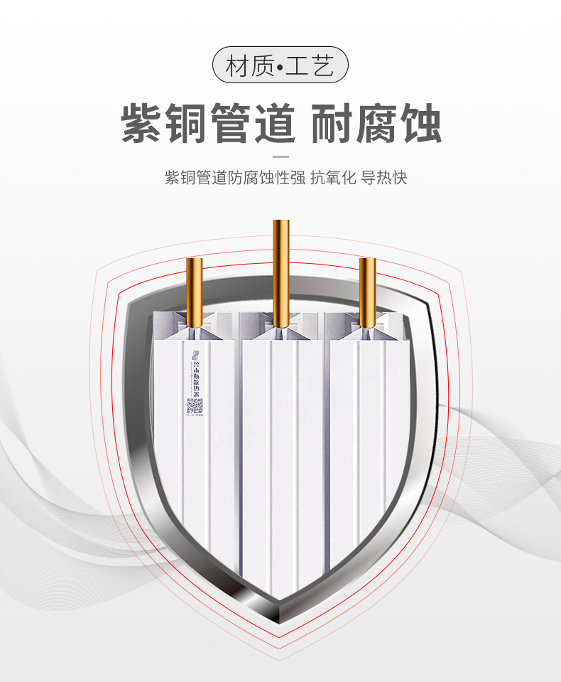 1、99.9%純度電解紫銅管,導(dǎo)熱性能好,節(jié)能,不腐蝕,是非常耐用的散熱器,使用壽命30年以上;