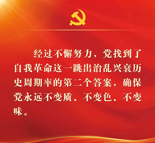 二、經(jīng)過不懈努力,黨找到了自我革命這一跳出治亂興衰歷史周期率的第二個(gè)答案,確保黨永遠(yuǎn)不變質(zhì)、不變色、不變味。
