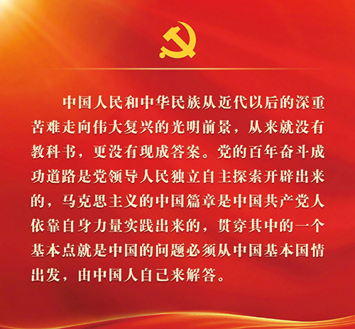 六、中國(guó)人民和中華民族從近代以后的深重苦難走向偉大復(fù)興的光明前景,從來就沒有教科書,更沒有現(xiàn)成答案。黨的百年奮斗成功道路是黨領(lǐng)導(dǎo)人民獨(dú)立自主探索開辟出來的,馬克思主義的中國(guó)篇章是中國(guó)共產(chǎn)黨人依靠自身力量實(shí)踐出來的,貫穿其中的一個(gè)基本點(diǎn)就是中國(guó)的問題從中國(guó)基本國(guó)情出發(fā),由中國(guó)人自己來解答。