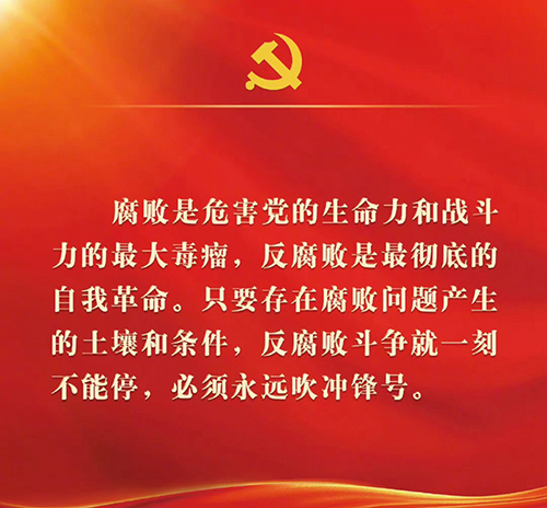 十、腐敗是危害黨的生命力和戰(zhàn)斗力的最大毒瘤,反腐敗是最徹底的自我革命。只要存在腐敗問題產(chǎn)生的土壤和條件,反腐敗斗爭(zhēng)就一刻不能停,必須永遠(yuǎn)吹沖鋒號(hào)。