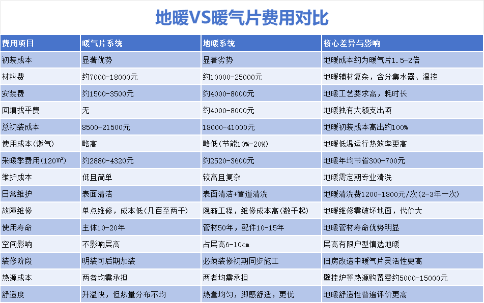 費用項目 暖氣片系統(tǒng) 地暖系統(tǒng) 核心差異與影響